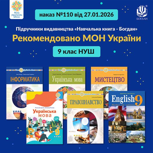 Усі підручники видавництва «Навчальна книга – Богдан» для 9-их класів отримали гриф Міністерства освіти і науки України! А це підтверджує високу якість та актуальність наших підручників та відповідність високим вимогам Нової української школи! Переглянути повні електронні версії підручників, безкоштовні електронні додатки та презентації можна на сайті видавництва: https://bohdan-books.com/edu9-2026/