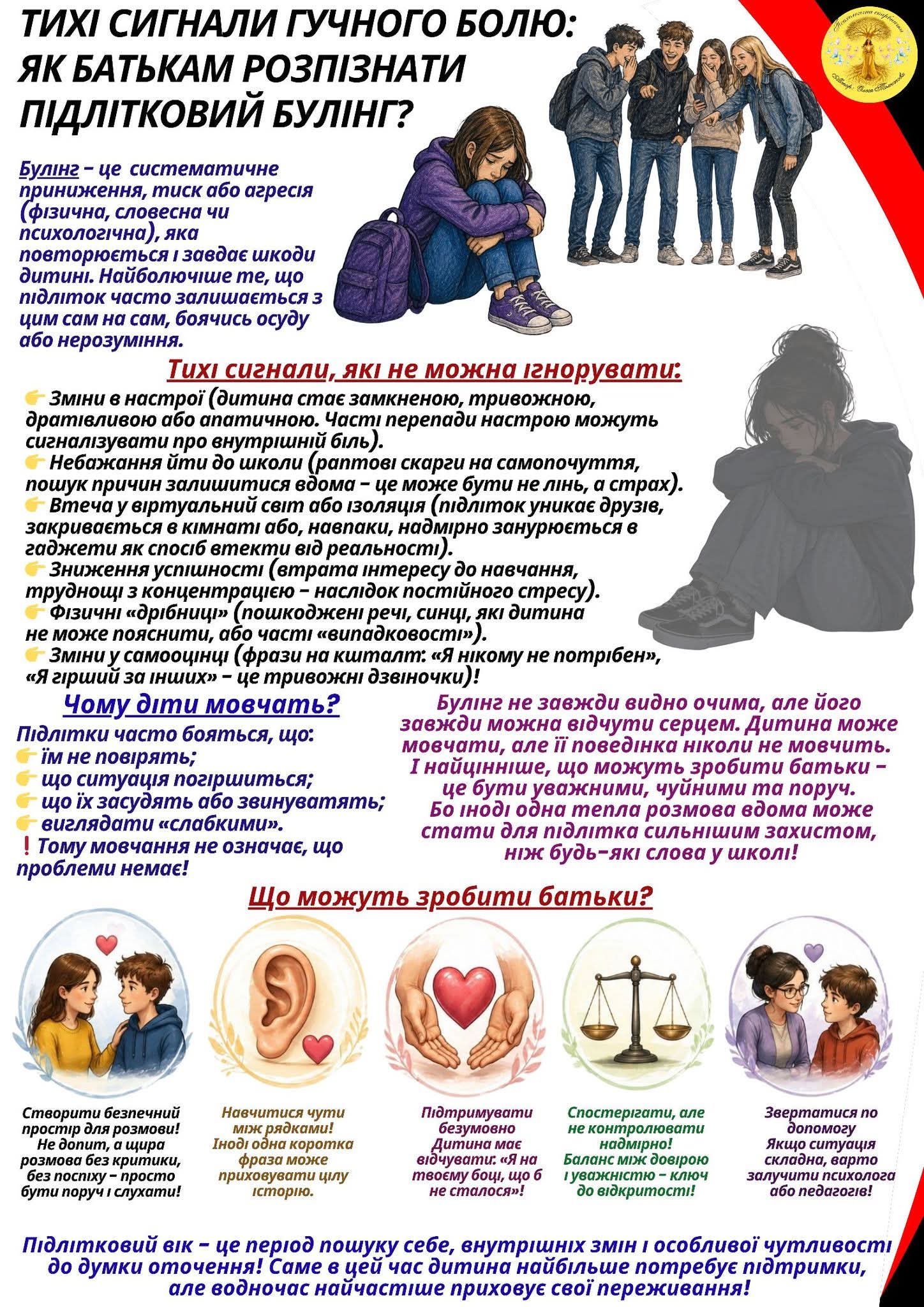 Головна / Психологічна підтримка та консультування / ТИХІ СИГНАЛИ ГУЧНОГО БОЛЮ: ЯК БАТЬКАМ РОЗПІЗНАТИ ПІДЛІТКОВИЙ БУЛІНГ?