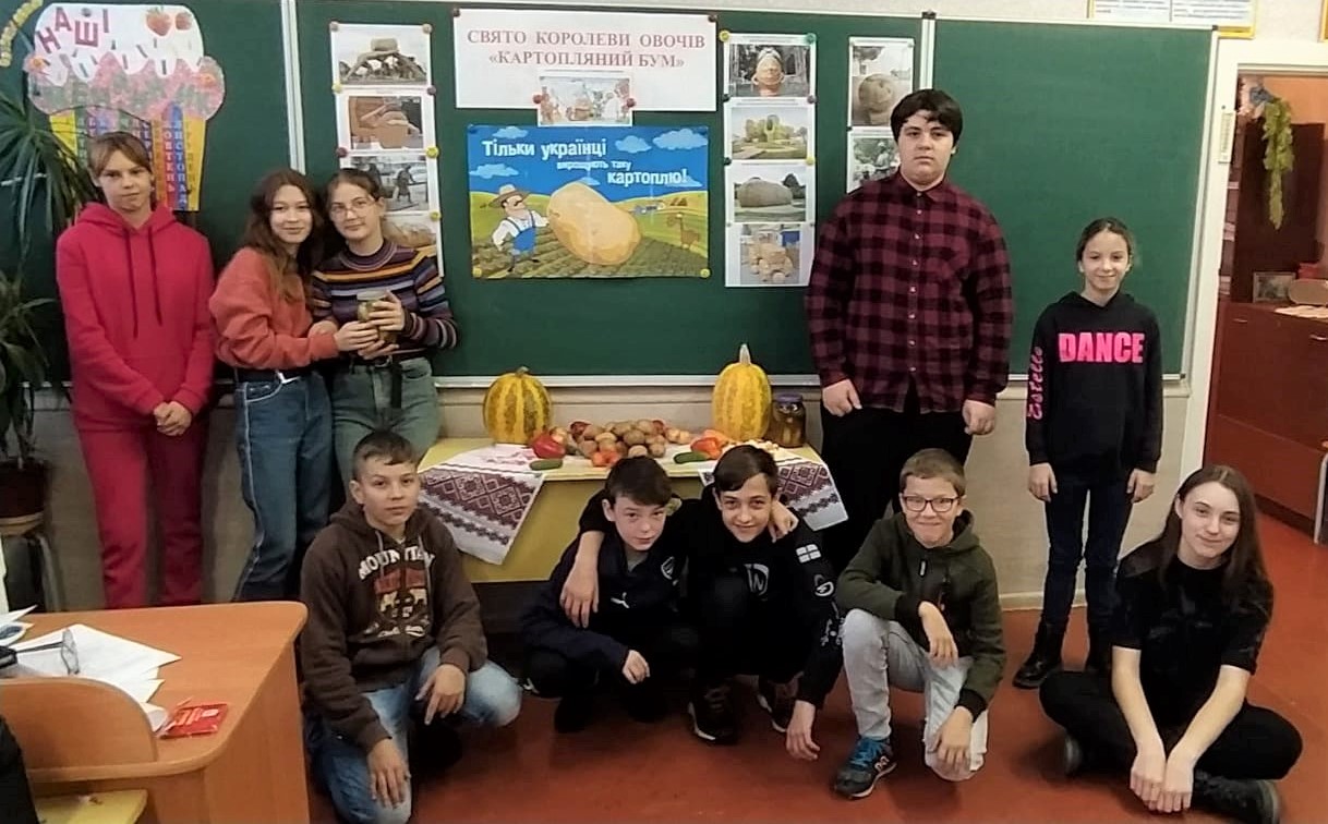 Канікули у розпалі, але мої семикласники сумують за школою. Тому в 7-В класі відбулось свято урожаю, присвячене цариці овочів картоплі – «Картопляний Бум». І навіть дощова погода не завадила всім, хто не поїхав з міста, зібратись, щоб дізнатись щось нове про цей шанований в Україні овоч, пограти у різноманітні «картопляні» ігри, послухати українські народні пісні про картоплю, а також посмакувати стравами з картоплі, які приготували дбайливі і працьовиті руки їх матусь. Між дітьми були розподілені ролі «історика», «біолога», «філолога». «Історик» Вялова Єва познайомила всіх з історією появи картоплі в Європі, «біолог» Діма Шарун повідомив про корисні мікроелементи, які містяться в картоплі та її поживну цінність, а «філолог» Литвин Артем розповів звідки картопля отримала свою назву. Ну а я, як хімік, пояснила, що з картоплі отримують корисний полісахарид – крохмаль, і розповіла, як за допомогою йоду можна визначити його вміст в різних продуктах. Семикласники з інтересом роздивлялись фото пам’ятників картоплі, які були встановлені в різних країнах світу, а також дуже здивувались, коли дізнались, що в Україні на колекційній 10-гривневій монеті також зображено цей овоч. Але особливо цікавими для дітей були ігри «Хто зайвий», «Ледачий агроном», «Склади слово», вікторина про картоплю. А Соня Манько, Аня Бойко, Єва Вялова навіть встигли виготовити своїми руками вироби з картоплі «Павучок та павутинка», «Чебурашка», «Півник». Активними учасниками всіх конкурсів були Янковенко Міша, Гречка Міша, Удянський Саша, Фабрицька Діана, Пупкова Таня. Кульмінацією свята стало смакування страв з картоплі! Як же постарались всі мами! Деруни і вареники, зрази і крученики, топтанка і пиріжки, а також огірочки, капуста та інші смаколики. Мені здалось, що вдома дітям було би не настільки смачно і весело їсти ці відомі кулінарні шедеври, як разом з однокласниками. Свято завершилось, але гарний настрій, позитивні емоції, веселі посмішки та пахощі від картопляних смаколиків ще довго будуть нагадувати нам про цей чудовий захід.