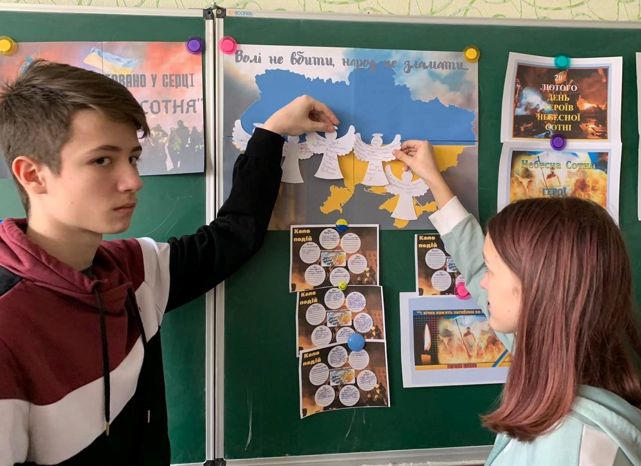 Учні 9-Ф класу ЗОШ №7 (класний керівник Котова І.С.) під час години спілкування стали учасниками патріотичного скрипту-зустрічі однодумців «Закарбовано в серці – Небесна Сотня». Готуючись до заходу, підлітки опрацювали історичні матеріали, переглянули відео, зібрали інформацію про смілян, які стали янголами, виборюючи гідність та незалежний вибір українців. Зібраний матеріал школярі розмістили на хмарній дошці Padlet, щоб мати можливість поділитися інформацією з однолітками, батьками, використати для написання єсеїв та наукових досліджень. Скрипт – це алгоритм, який дозволяє співрозмовникам групи будувати спільні дії за визначеним сценарієм. Тож, виконуючи завдання алгоритму, діти згадали буремні події 2013-2014 років, створивши коло подій. Українці, які зібралися на Майдані, не думали про те, що можуть загинути. Вони лише знали, що так як є, так далі бути в Україні не може. Тому й відстоювали загальнолюдські цінності. Дев’ятикласники продемонстрували свої знання цінностей, виконавши мовознавче завдання «Будь уважним». Доводячи, що знання можуть бути зброєю, учні розгадували історичні шаради, створювали асоціативні ланцюжки до слова «ПАТРІОТ». Емоційною кульмінацією заходу стало створення колажу «Ангели пам’яті». Під пісню «Ангели Майдану» підлітки створили ангелів, на яких написали побажання державі, яка сьогодні, як ніколи, потребує єдності та миру. Захист Небесної Сотні нас не лишає й на мить, Але сьогодні – пора тривожна, дуже усім болить… Те, що зробили Герої, наша мета – зберегти! Господи, Україну для майбутнього захисти!