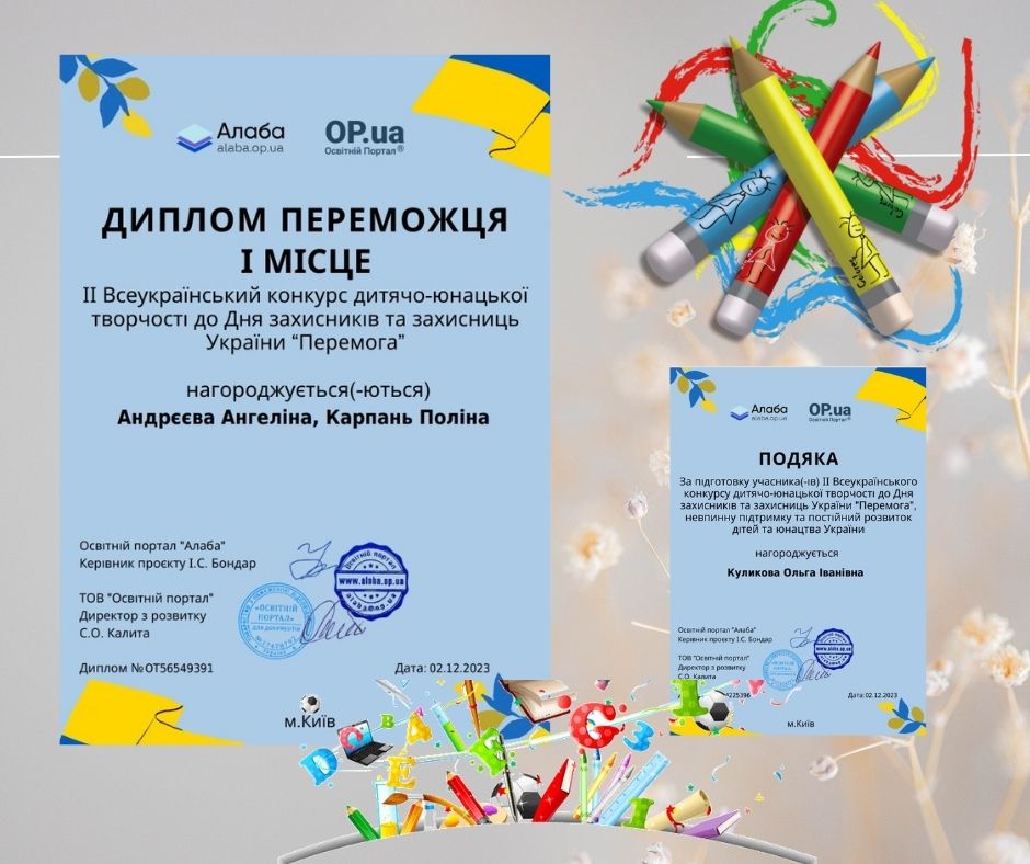 Щиро вітаємо учениць 9-А класу Андрєєву Ангеліну та Карпань Поліну з перемогою - І місце - у ІІ Всеукраїнському конкурсі дитячо-юнацької творчості "Перемога" та бажаємо натхнення для нових мистецьких звершень!
